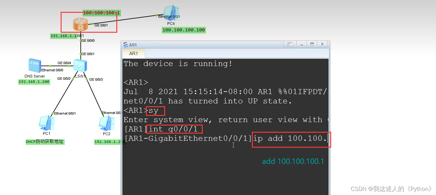 在这个接口上配置ip add 100.100.100.1 255.255.255.0配置完打开右边那台电脑ping 100.100.100.100