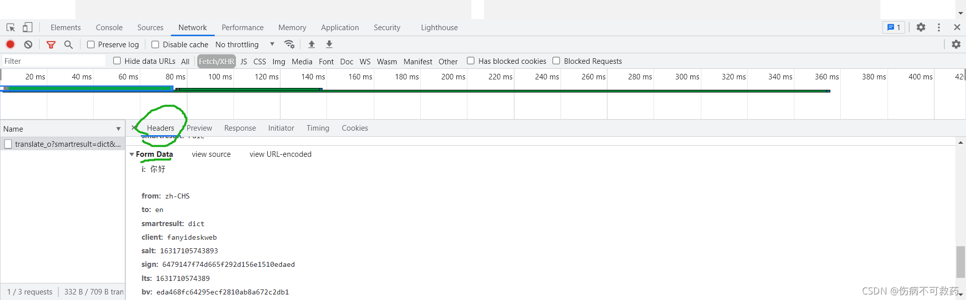 我们输点英文单词去翻译一下,发现地址栏并没有发生改变,那么可以判断要用post方法(因为ajax请求)。
