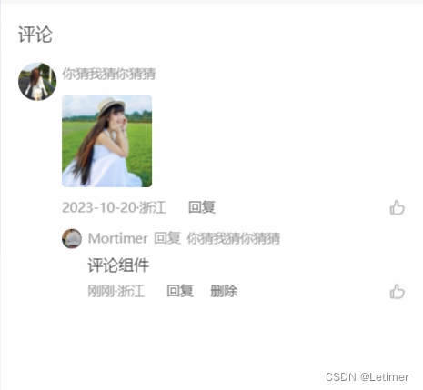 uniapp实现一个评论区 所以我们需要画出大致的布局,先上组件代码Index.vue代码,再上comment.vue。无非就是写个评论区页面,将需要的参数通过props传入,将需要抛出的事件通过emit抛出。自己回复的评论可以进行crud, 对于他人的评论仅仅只能评论。分父级(主评论)和子级(子评论)还是话不多说,先上效果图。有问题可以一起沟通哦~