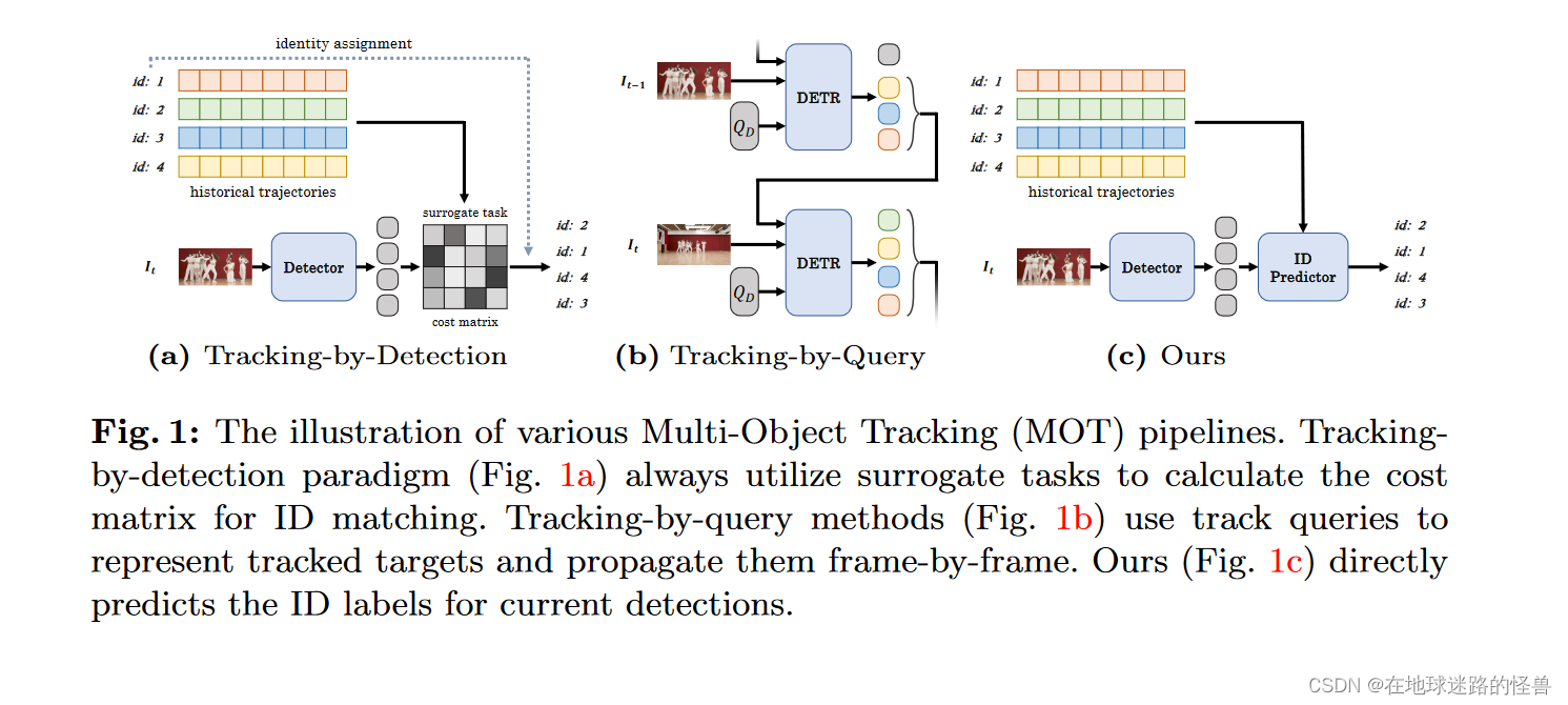 图一:各种多目标跟踪( Multi-Object Tracking,MOT )流水线的说明。检测追踪范式(图1a )总是利用替代任务来计算ID匹配的代价矩阵。逐帧跟踪方法(图1b )使用跟踪查询来表示被跟踪的目标,并逐帧传播。我们的方法(图1c )直接预测当前检测的ID标签。