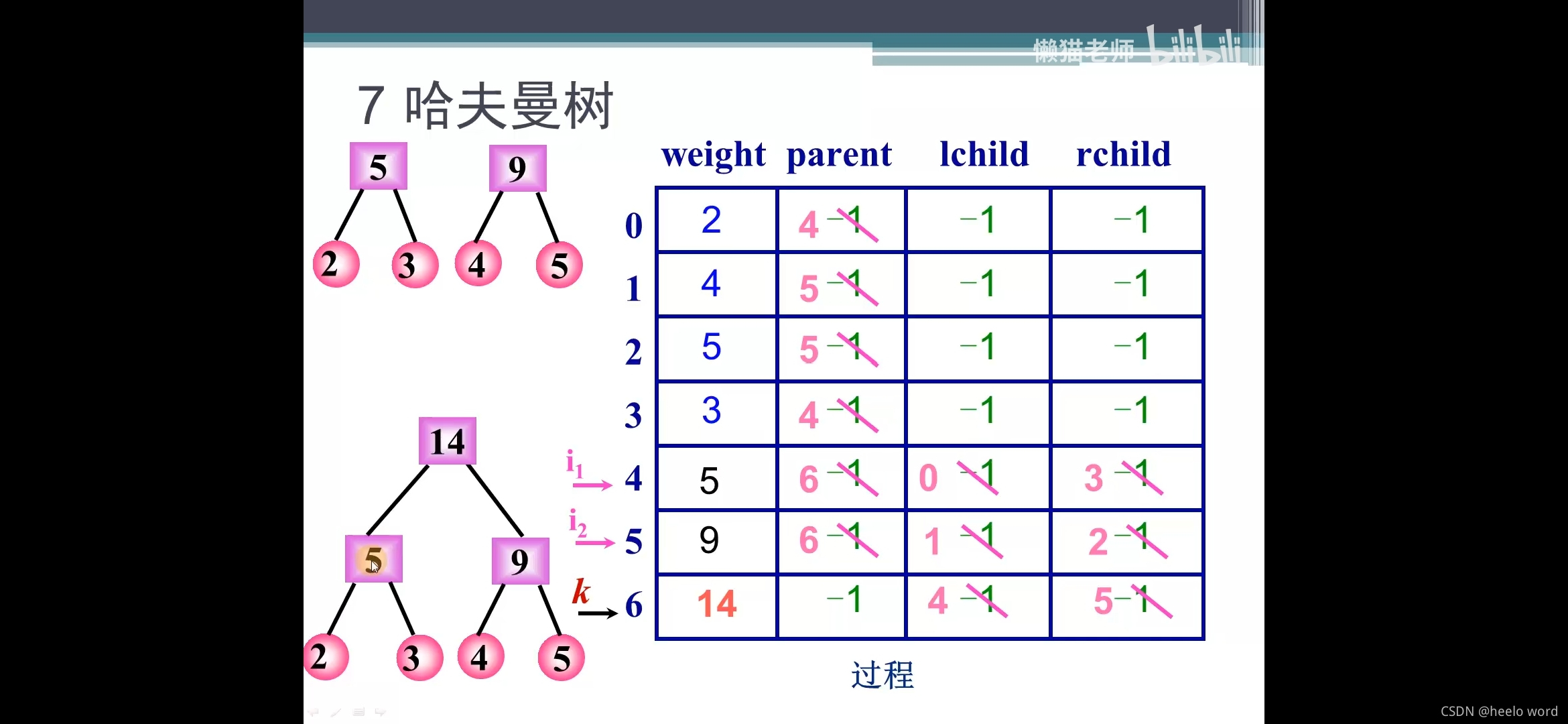 huffTree[k].lchild = i1; //把双亲结点的左右孩子域更新