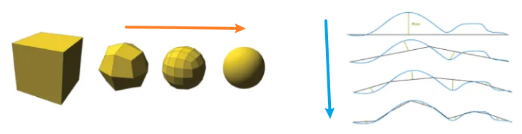 将立方体逐渐细分为球体;将一条直线进行细分,向一条曲线慢慢逼近。