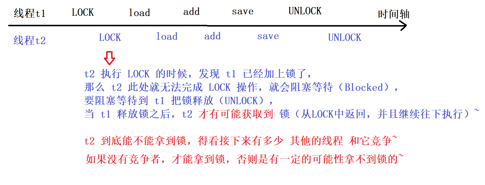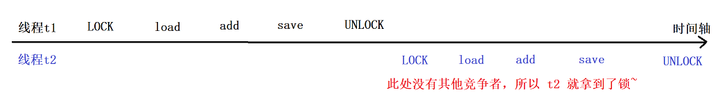 LOCK 这个指令是互斥的,当 线程t1 进行 LOCK 之后,t2 也尝试 LOCK,那么 t2 的 LOCK 就不会直接成功!!!