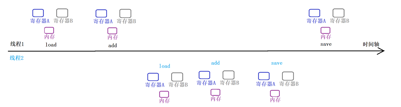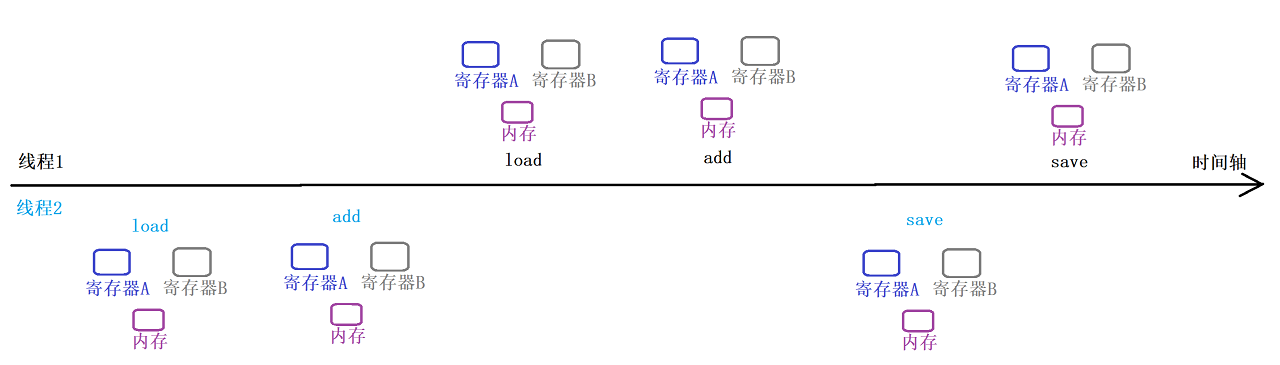 寄存器A 表示 线程1 所用的寄存器,寄存器B 表示 线程2 所用的寄存器~
