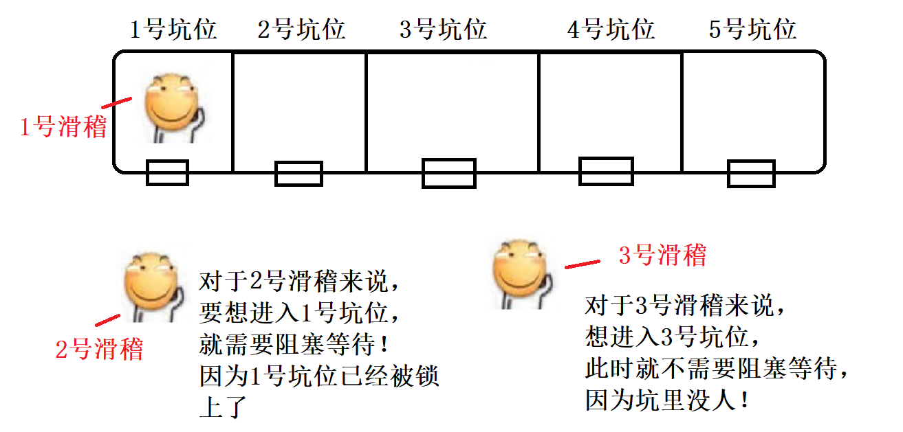 换句话说,1号滑稽 进入1号坑位,只是针对 1号坑位 进行了加锁,别人想要进入 1号坑位,就需要阻塞等待;但是 如果想要进入其他的 空闲坑位,那么则不需要等待~
