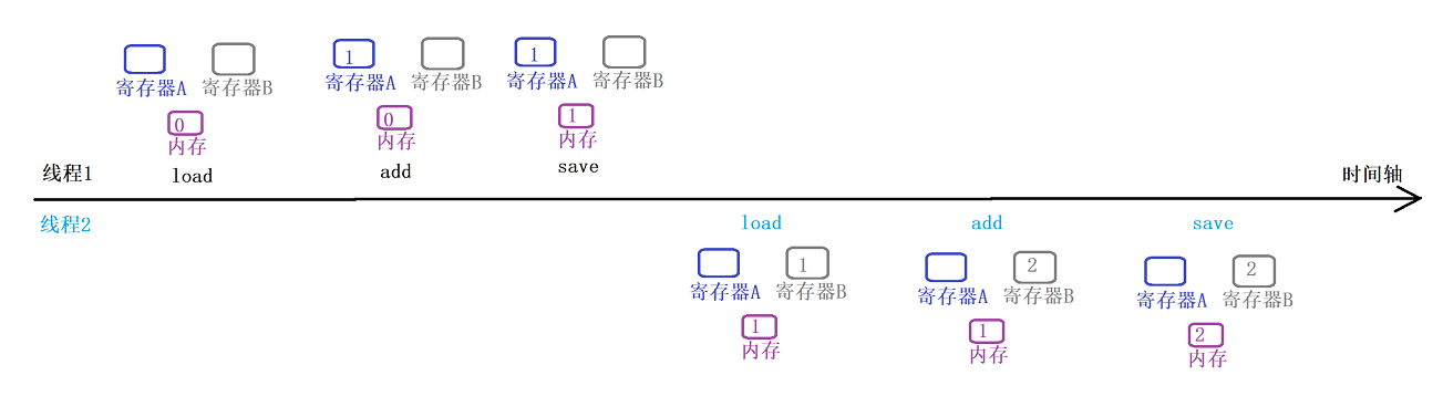 对两个数进行自增操作,内存 初始值为 0,两个线程进行并发执行,进行两次自增~