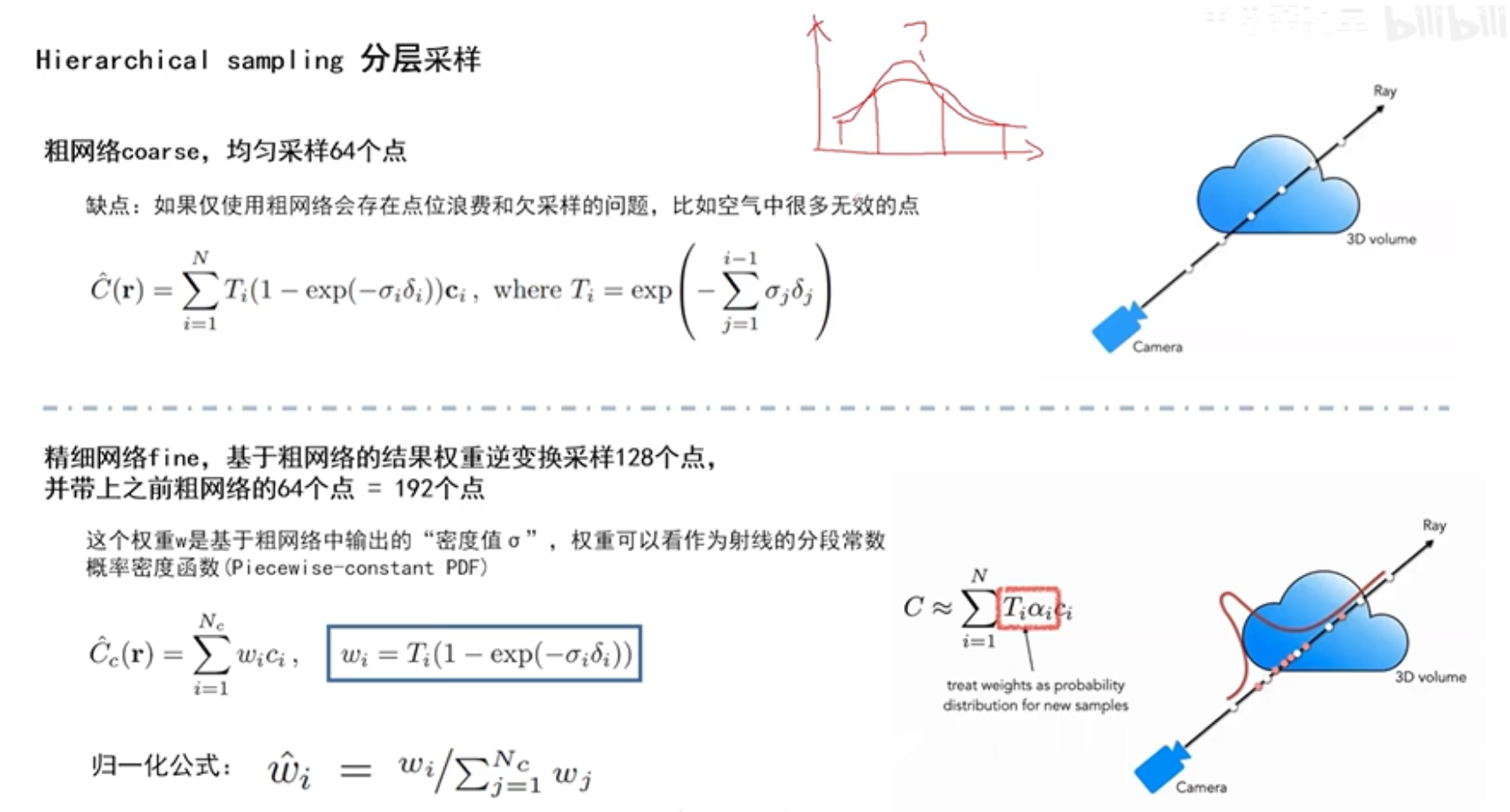 会产生权重值,也就是不透明值大的,权重也会大一点。然后精细网络会利用粗网络得到的权重值,进行逆变换采样,取128个点,权重值大的采样点就分布多一点,权重值小的就分布少一点,所以一共取了128+64=192个点