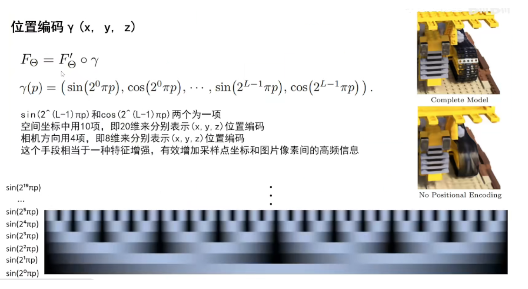 位置编码是为了突出图片的高频(边缘轮廓)信息,提高图片的细节质量,使得高频信息不会因为周围像素的平滑的影响。上图可以看出加了位置编码和不加位置编码图片的明显区别,每个位置编码都是由sin和cos两项组成的,上图是sin的图,可以看到它可以进行特征的增强。其中对于空间位置,是利用20维的位置编码分别对(x,y,z)三个方向进行特征增强,那么每个方向就不是单纯的一维描述位置信息,而是21维,一共63维;对于相机方向,是利用8维的位置编码分别对相机的方向(θ, φ)的两个参数的方向向量进行特征增强,那么每个方向向量就不是单纯的一维描述位置信息,而是9维,一共27维。