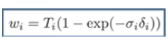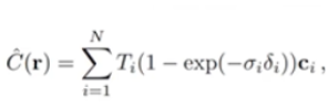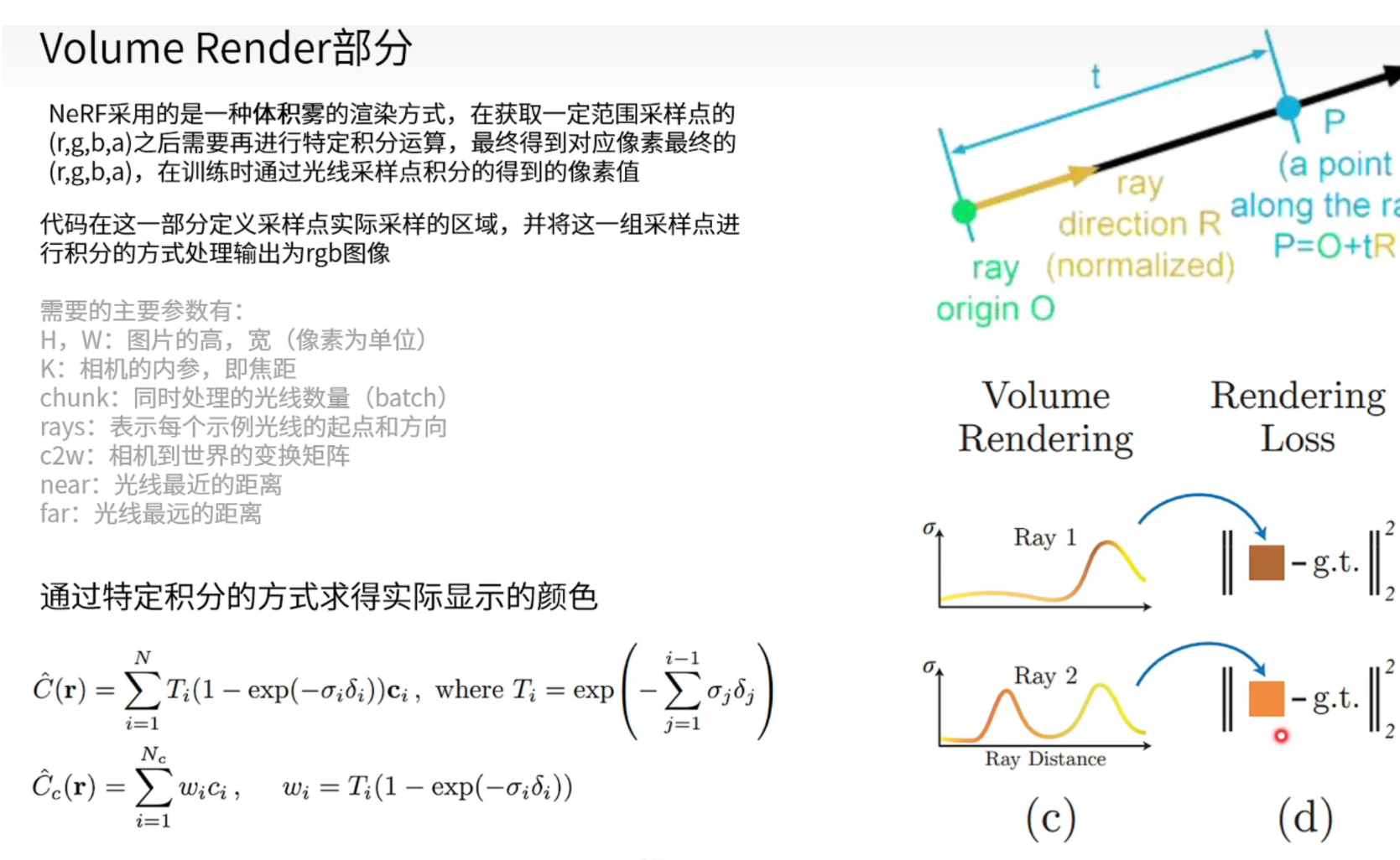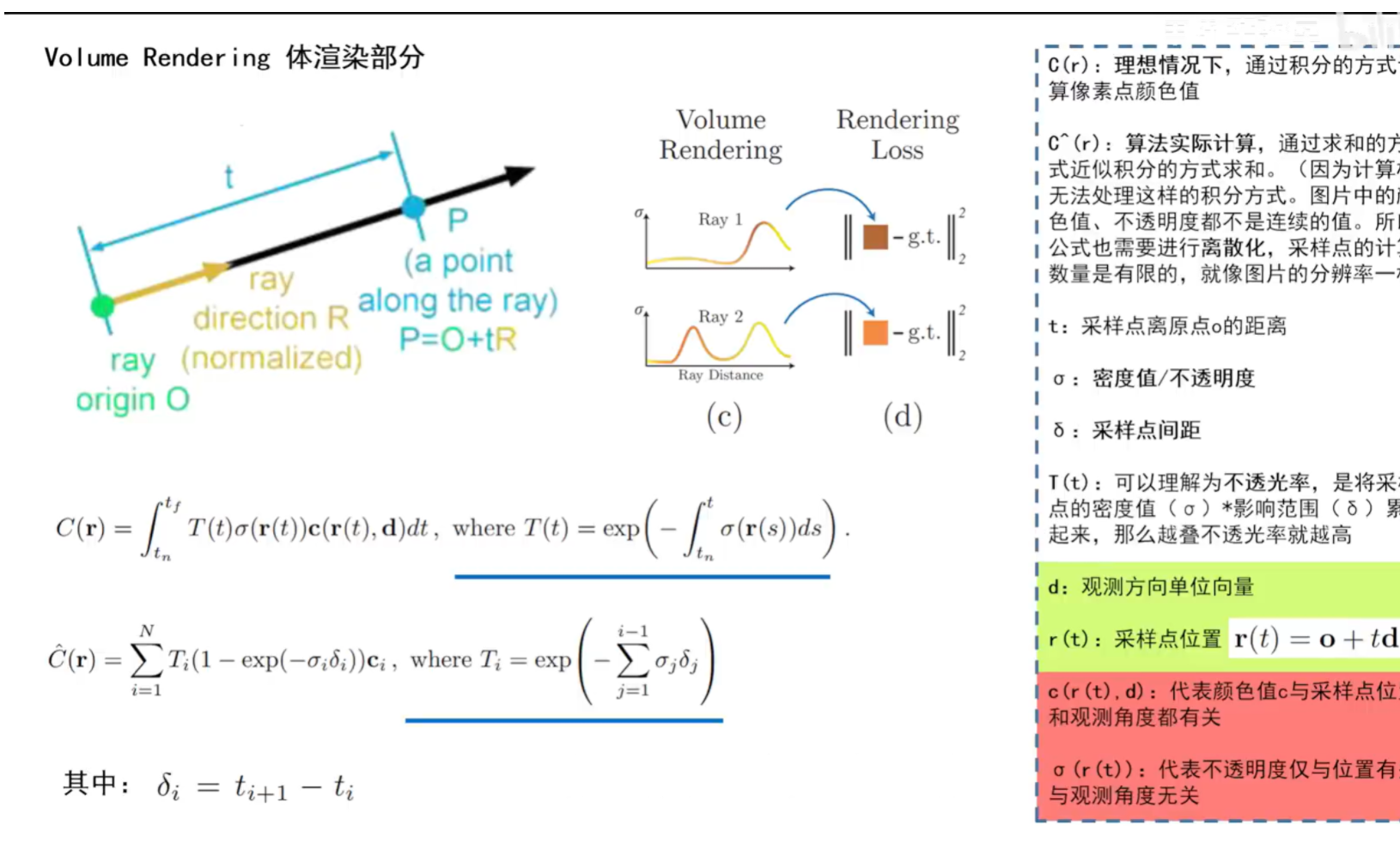 如何将采样点的颜色和密度值应用到图片像素点的颜色当中去(Nerf最终得到的是新视角图像,而不是三维模型)。首先看采样点如何获得,它是通过相机的位姿经过简单的数学运算r(t)=o+td获得的,其中o是相机出发点,t是采样点离出发点的距离,d是相机方向。r(t)就是采样点的位置。那么有了采样点的位置以及相机方向参数之后,就可以获得采样点的颜色和密度值,那么如何将这个颜色和密度值应用到图像的像素点上面去?首先看到第一个公式C(r),该公式是理想情况下的,其中的T(t)是指不透光率,也就是不透明值(σ)*影响范围(δ),其中影响范围也是用积分表示的,然后累加,越叠加不透光率就越高,T(t)想要强调不透光物体的前面,而不是背面;σ(r(t))是指只与采样点位置有关的密度值;c(r(t),d)是指与采样点位置和相机方向都有关的颜色值,然后将这些值相乘后进行积分来求得图像像素点的颜色值。而现实情况中不可能对这些公式进行积分,因为采样点是离散的,不是连续的,因此利用一个近似积分的求和来求解C^(r),其中对应的地方进行了替换,如T发生了变换,变成两个值相乘,因为积分本来也是面积,虽然发生了变换,但是C(r)与C^(r)表示的意思是一样的。那么这个公式就可以理解为,利用近似于积分的求和操作,完成了体渲染过程,由一组采样点的输出值,得到图片像素点的颜色。