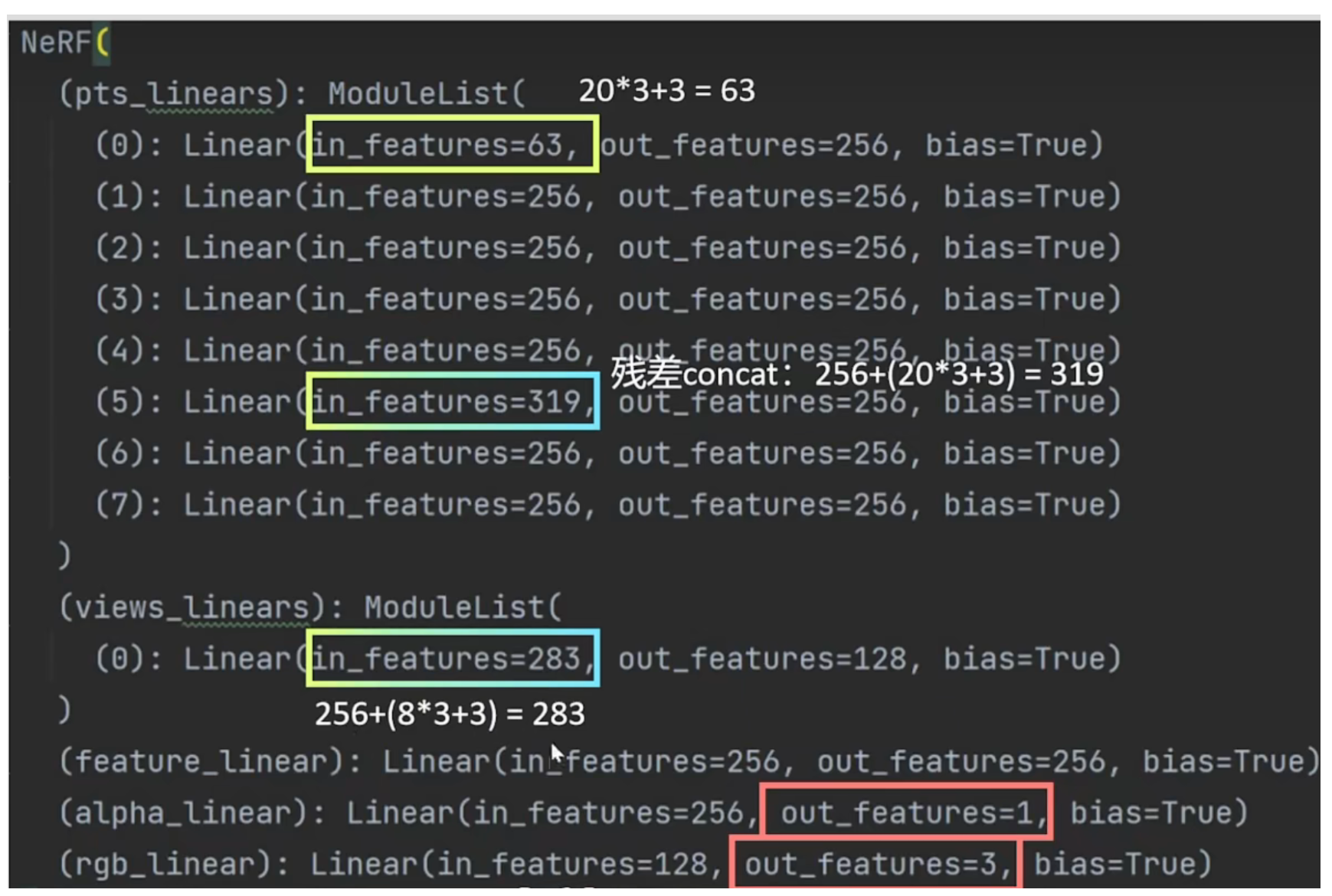 上述代码部分可以清晰的看到Nerf网络结构图中维度的变化,首先是输入层63维度,然后是到了第5个隐藏层,加入残差结构,形成256+63=319维度的隐藏层,然后恢复到256维度,然后是隐藏层加上相机方向参数,以及它的位置编码得到283维的隐藏层,最后是输出1维度的 σ值和3维的RGB值。