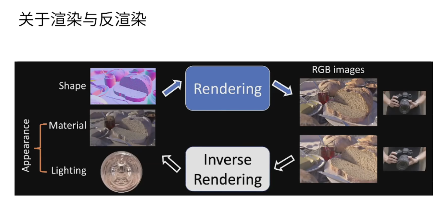 为什么Nerf叫做神经隐式的三维重建?这要从计算机图像学领域的渲染说起,渲染方式是基于三维模型的材质以及光照信息,通过一个视角将物体渲染成比较精美的画面,也就是上图的rendering内容。计算机图形学还有一个反渲染的过程,也就是上图的inverse rendering过程,也叫做三维重建,主要是通过渲染后的图片重新得到我们的三维模型,最后的三维模型是用体素、网格或者点云来表示的。Nerf也是三维重建中的一种,只不过它与以前的三维重建不同,以前都是基于多张图片,就可以恢复出点云、网格或者体素的模型,将三维模型的信息存储在点云、网格或者体素中,而Nerf是基于一种神经隐式网络去获得三维模型的,将三维模型的信息存储在隐式神经网络中。