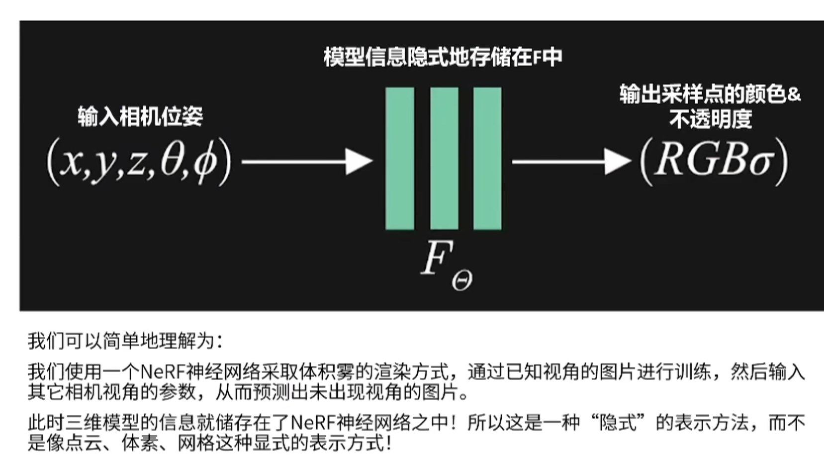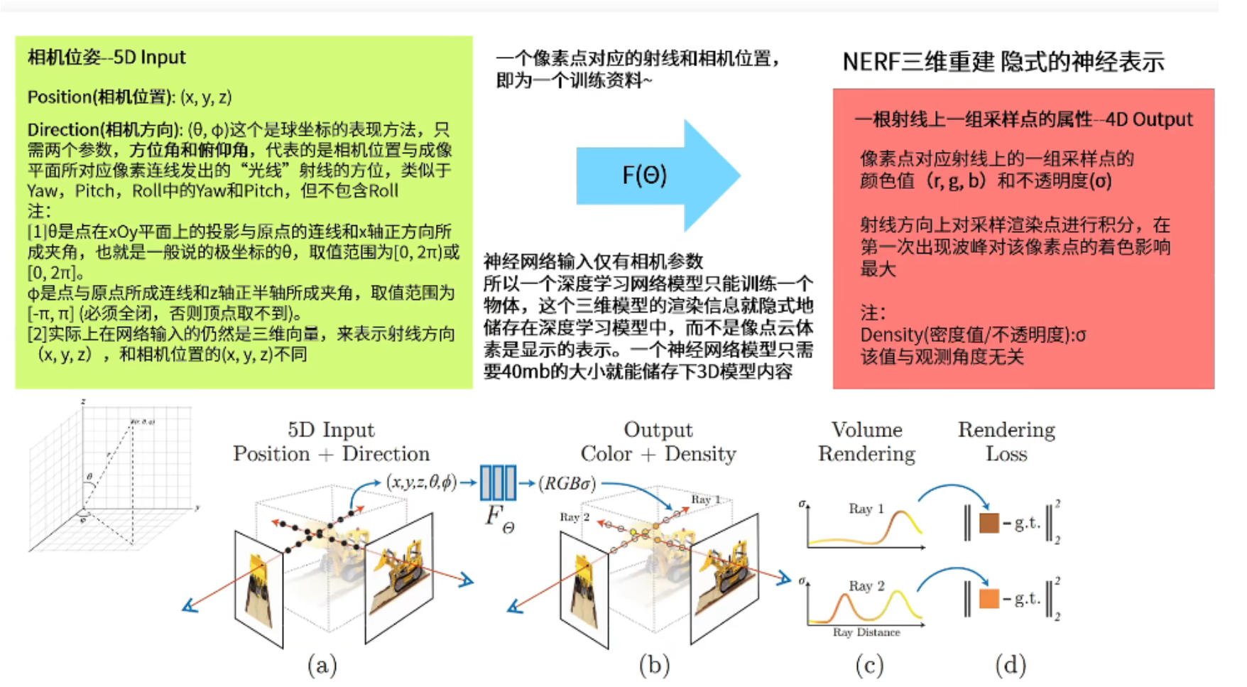 那么说明叫做神经隐式?上图可以很明显的看出,由于将物体的三维信息都存储在神经网络中,所以叫做神经隐式。Nerf的输入是每个采样点的位置(x,y,z),以及相机的方向参数(θ, φ),输出是采样点的颜色RGB和密度 σ。也就是或通过输入采样点的位置以及相机的相关参数,经过Nerf神经网络的一个训练,就可以得到一张未知视角的图片。这一过程也说明了Nerf的工作原理,就是利用Nerf神经网络的体积雾渲染方式,通过对已知视角的图片进行训练,然后在输入其他视角的参数,最后就可以得到未知视角的图像,此时的三维模型信息存储在神经网络中,不像点云、网格和体素那种显示的表示方式。