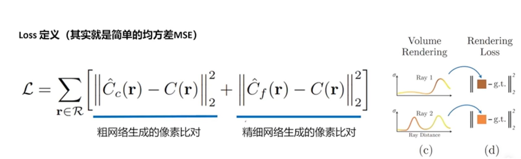 Nerf的损失函数很简单,就像素点的计算的密度值和颜色值与理想情况下像素点的计算的密度值和颜色值分别在粗网络和精细网络中的差值进行相加。