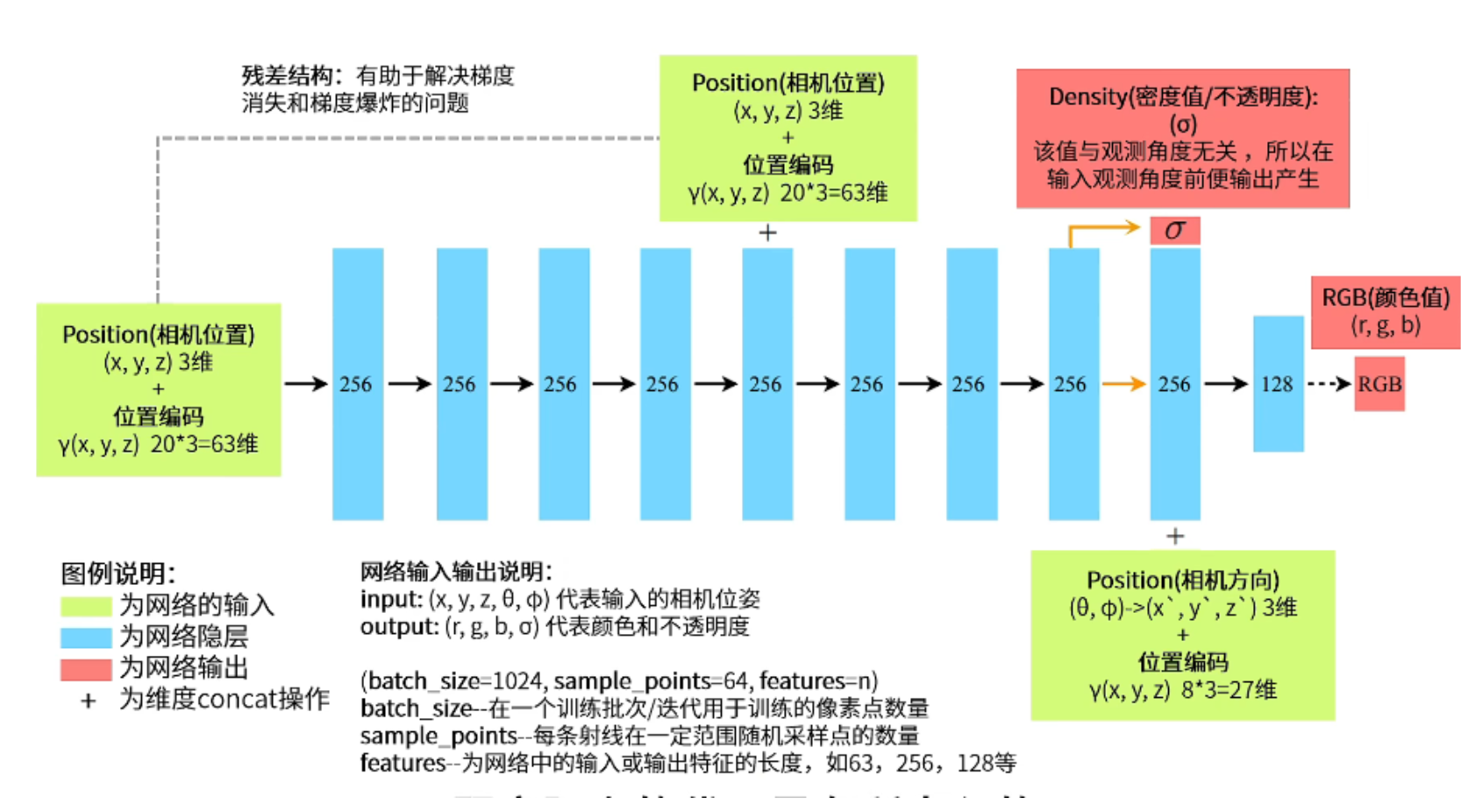 注意采样点的位置(x,y,z),以及相机的方向参数(θ, φ)都是可以通过相机位姿计算获得。基于相机位姿得到的采样点就像是点云或者体素,只不过是基于相机特定角度获得的一组点,而不是散落在空间中固定的点。