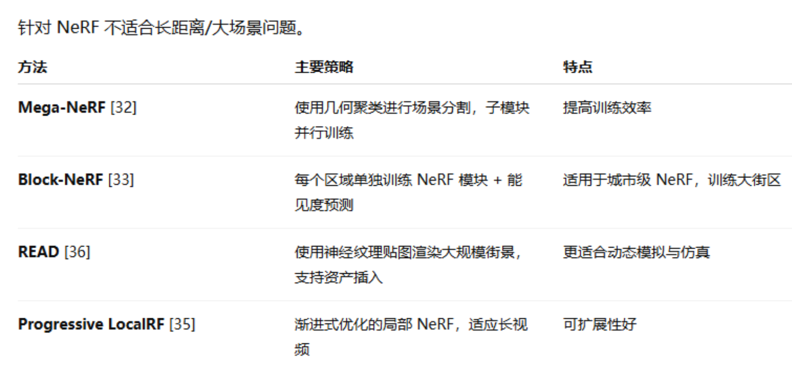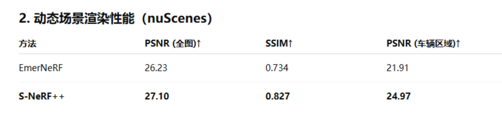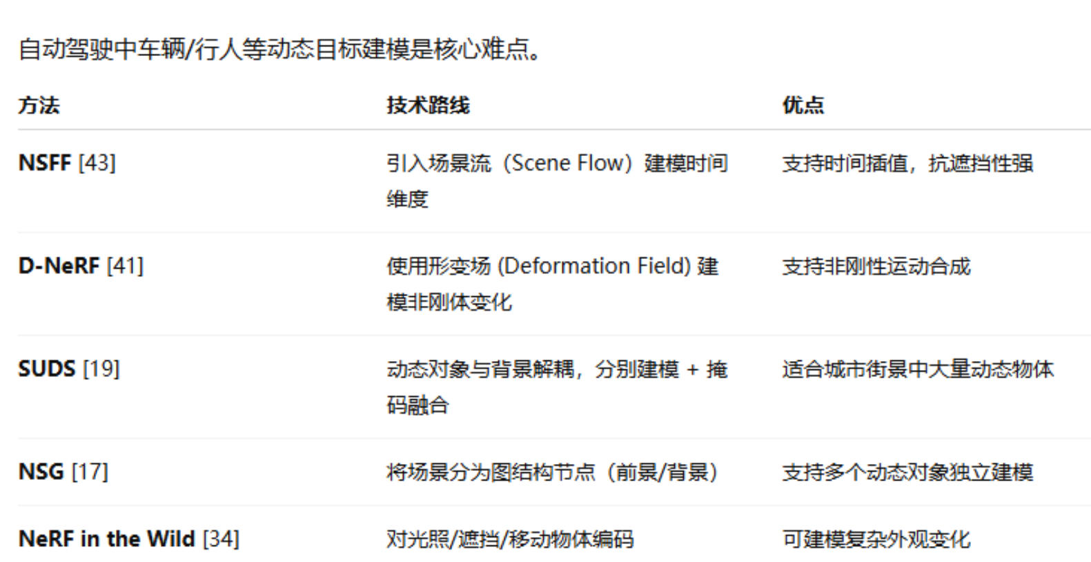 | 动态处理 | 显式剔除动态对象后重建静态背景 | 学习动态对象与背景的联合体渲染 | 明确多实例前景 NeRF(需标签) | 无监督 flow 引导动态区域建模 |