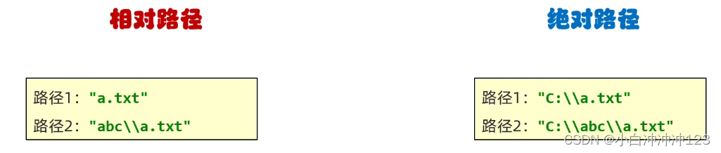 路径分为相对路径(不带盘符),绝对路径(带盘符)