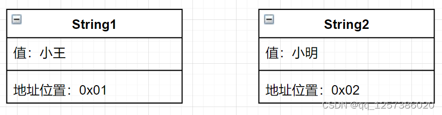 首先我们先创建两个变量并初始化,String1 = “小王” String2 = “小明”,两个变量在内存中是以以下形式进行存储的