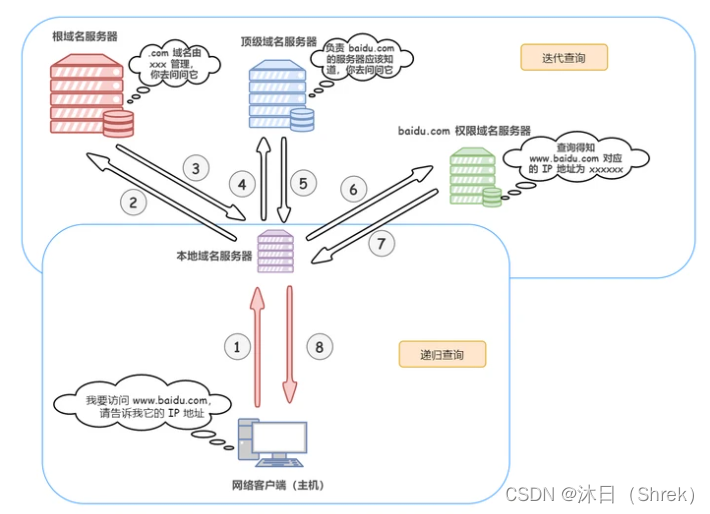 DNS协议及其DNS完整的查询过程 DNS(Domain Names System),域名系统,是互联网一项服务,是进行域名和与之相对应的 IP 地址进行转换的服务器简单来讲,DNS相当于一个翻译官,负责将域名翻译成ip地址解析域名的过程如下:流程如下图所示:...