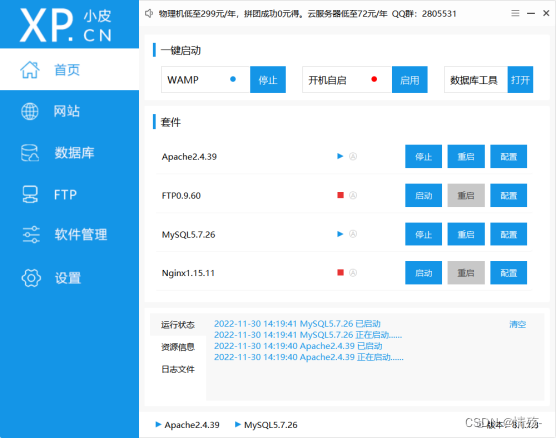 此时,各项配置都为红色,表示并未开启服务。我们点击启动开启相应配置。