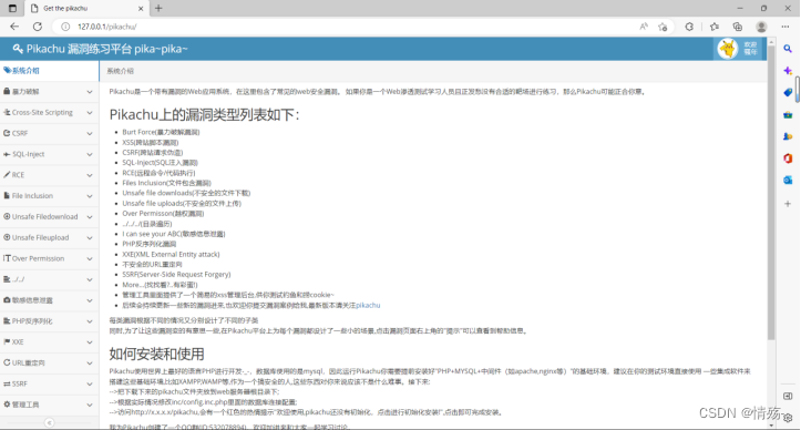 搜索127.0.0.1/pikachu,即可进入pikachu靶场。