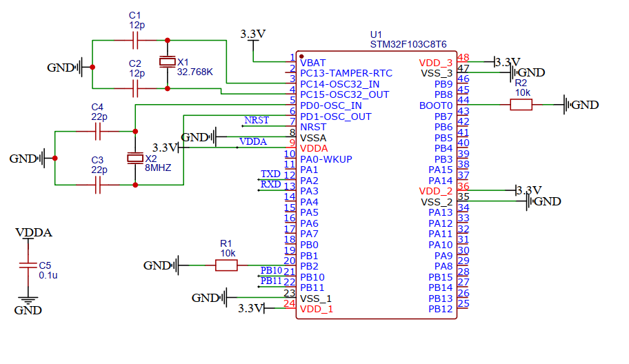 由于主控芯片是STM32F103C8T6,这块芯片的供电电压是3.3V,而我们采用的是纽扣电池,两个纽扣电池串联是6V,我们需要降压模块来把6V降到3.3V,同理,蓝牙模块是5V供电,也要把6V降到5V,有了5V和3.3V的两个经典工作电压,电源这一块应该没什么问题了。