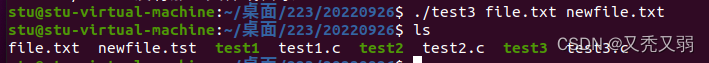 在执行时,共有三个参数,argv[0]为./test3的参数指令,argv[1]指向源文件file.c,即被复制的文件,argv[2]指向目标文件newfile.txt,即被粘贴内容的文件。在运行后便可看到新生成的newfile.txt文件,该文件内容是复制file.txt的内容,这样我们自己的cp复制指令就完成了。