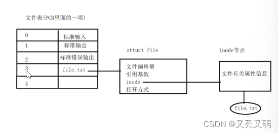 - 左一:PCB里的文件表,其中的01234就是文件描述符,0,1,2指代的内容要记住。
