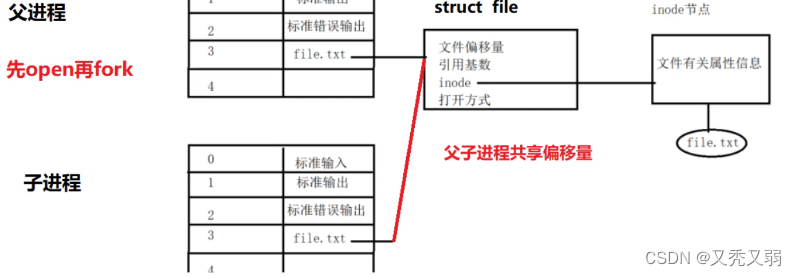 - 文件内先在父进程内打开open文件,然后fork()复制出子进程: