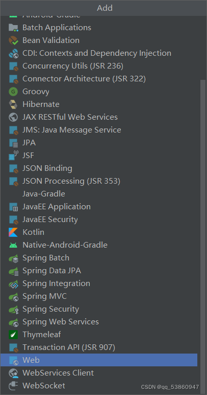 4、点击加号,会出现一个列表,先找到web文件包,点击"apply",最后点击"ok"即可