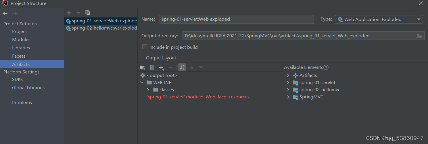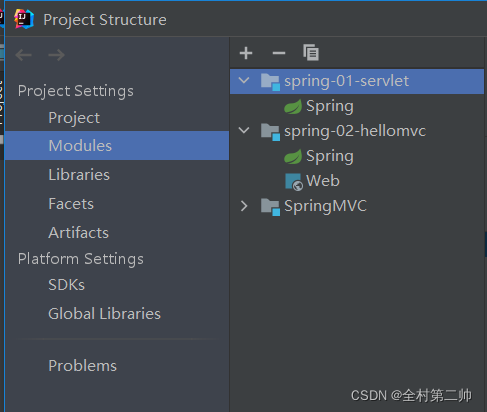 3、找到Project Structure下的Moudles,并找到文件夹所在模块spring-01-servlet,打开会发现少了web文件,这时候就要手动导入web文件了
