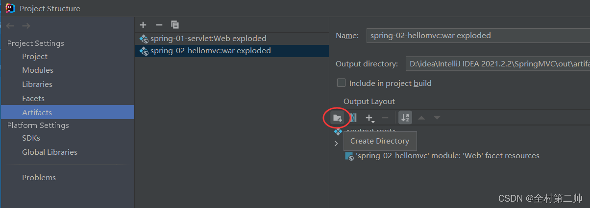 1、先在Settings里找到Project Structure,然后找到Artifacts,点击Create Directory,在WEB-INF文件夹下创建lib包