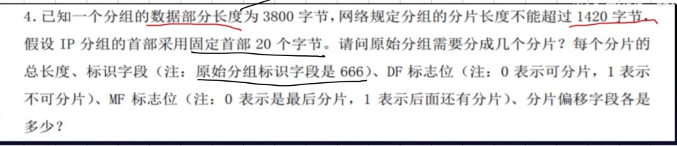 对于本题,数据部分长度不包括首部,网络规定分片长度不能超过1420字节,即数据段不能超过1400字节。因此,进行分片时我们有:3800/1400=2....1000