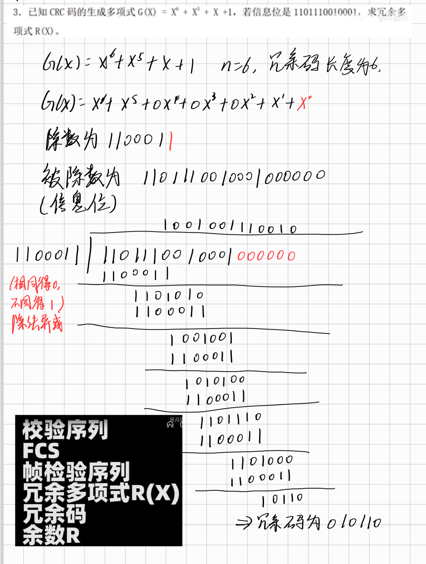 step 4:被除数与除数相除,按位异或(相同得0,不同得1),最后得出的余数即为冗余码。当余数位数小于冗余码位数时,应在余数前补0。此外,冗余码还有很多其他说法,FCS,余数R...等等。