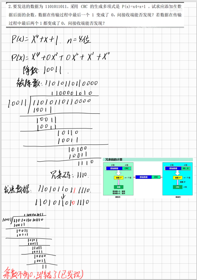计算出冗余码后,在信息位后补上冗余码,与除数相除,若仍有余数(余数不为0),说明出错。具体示例可见下图: