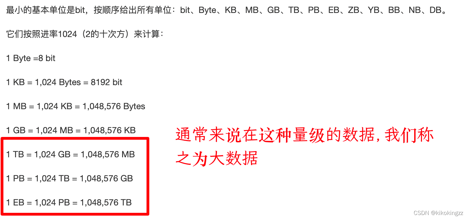 截至目前,人类生产的所有印刷材料的数据量是200PB,而历史上全人类总共说过的话的数据量大约是5EB。当前,典型个人计算机硬盘的容量为TB量级,而一些大企业的数据量已经接近EB量级。