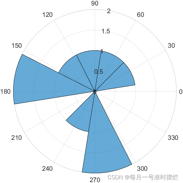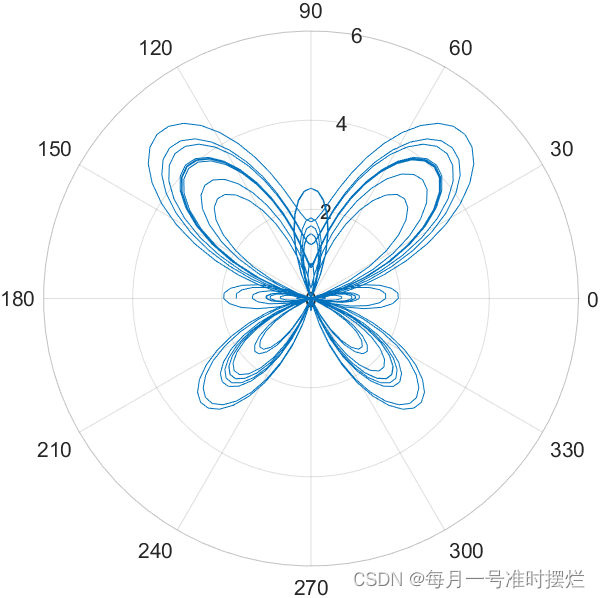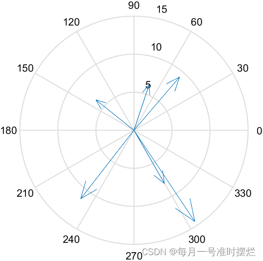 极坐标轴图以从同一点开始的轴上表示的三个或更多个定量变量的二维图表的形式显示多变量数据的图形方法。它可以将多维数据进行表示,但是点的相对位置和坐标轴之间的夹角是没有任何信息的。MATLAB中使用polarplot函数来绘制极坐标图,其调用的格式如下所示:
