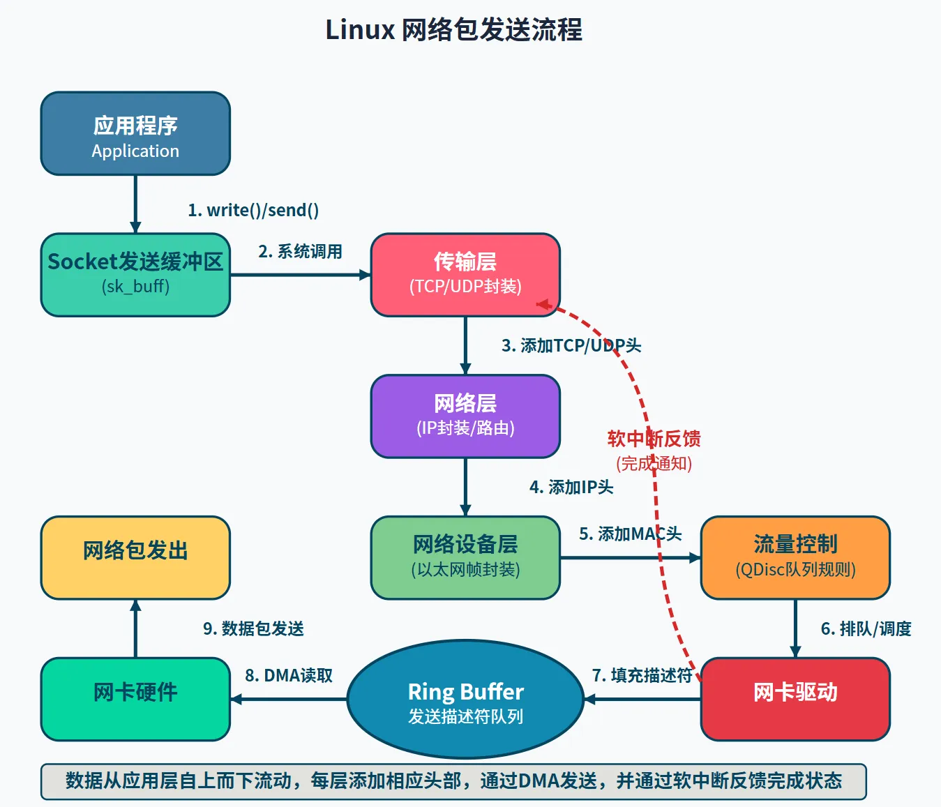 - 驱动程序处理中断,触发软中断通知传输层发送完成