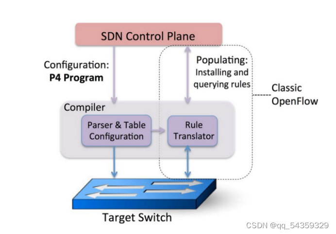 P4是一种抽象 完全符合网络中透明性的定义。只需要管任务完成,而不需要管理底下硬件的实施。和传统的Open Flow进行比较,是一种通用的API而不需要进行不断的拓展,编译器会将P4程序映射到目标交换机之中。