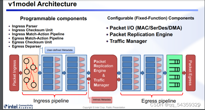 这两个流水阶段都是可编程的。Ingress/Egress每个阶段都可被划分成三个可编程模块:parser、ingress/egress、deparser。P4程序也基本是针对这六个模块进行编程的。每个报文经过这些处理单元时候,始终都有一块内存用于存放metadata数据,缓存中间处理数据和结果,这些meta信息可以是action的输出结果,也可以是下一个table里match的输入。知乎