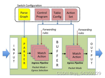P4交换机将流水线处理数据的过程进行抽象和重定义,数据处理单元对数据的处理抽象成匹配和执行匹配-动作表的过程,包头的解析抽象成P4中的解析器,数据处理流程抽象成流控制。