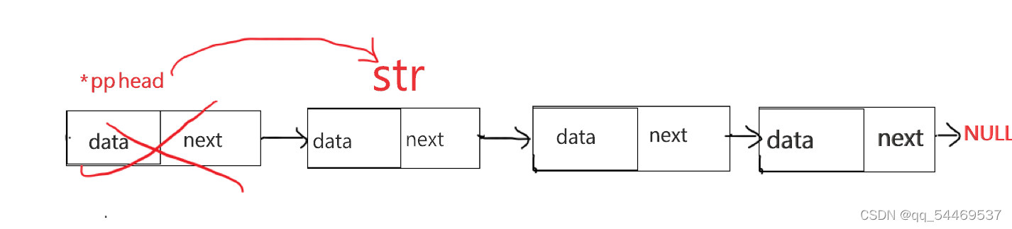 3)结点数大于1时,创建一个新指针str ,使str指向头结点的下一个结点,然后将头结点释放,此时再将str的地址赋给*pphead,使其成为头结点
