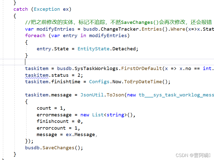 在savechanges()时,如果需要进行 savechanges() 报错之后的 数据处理,在try catch 中 捕捉异常,记录,然后修改别的实体,这次savechanges() 还会报错。