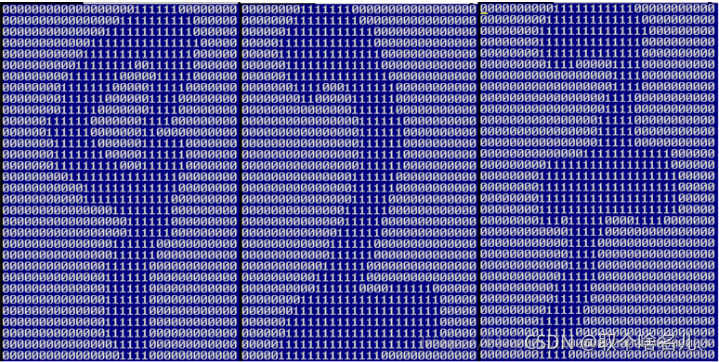 书中提供数据0到9如图所示,世纪图像存储在源代码的两个子目录里:目录trainingDigits中包含了大约2000个例子,每个例子的内容如下图所示,每个数字大约有200个样本;目录testDigits中包含了大约900个测试数据。两组数据没有重叠。