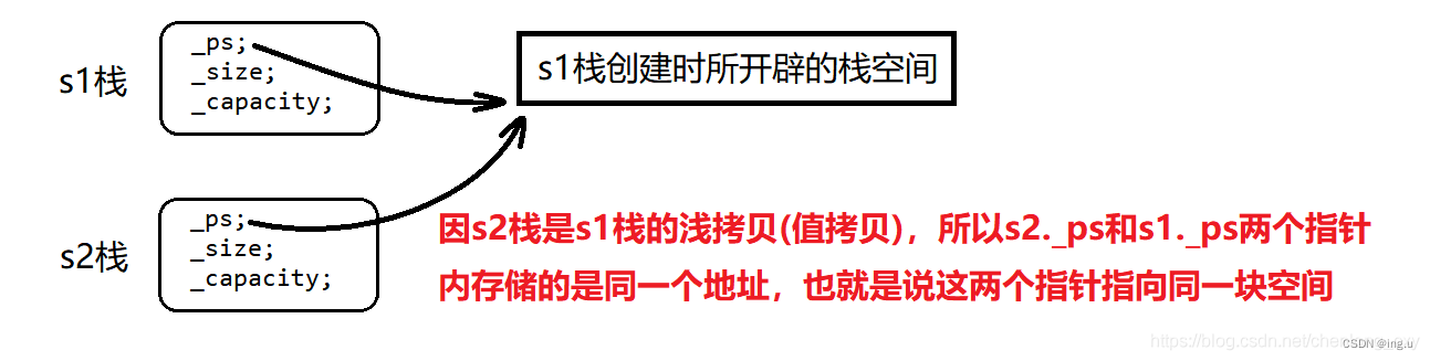 创建栈对象s1,s2,如果是编译器默认生成的浅拷贝,通过打印地址发现,s1,s2是同一片空间,那么对s1的改变直接影响s2,并且析构函数的时候会报错,同一片空间析构了两遍。