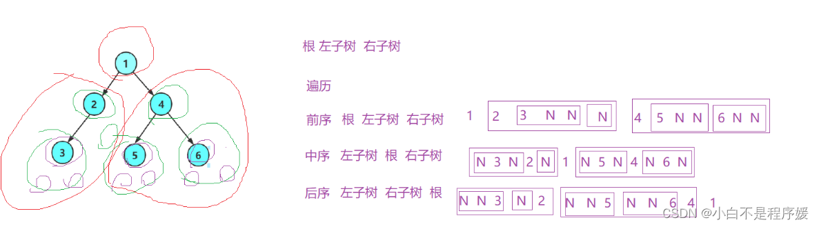 由于被访问的结点必是某子树的根,所以N(Node)、L(Left subtree)和R(Right subtree)又可解释为根、根的左子树和根的右子树。NLR、LNR和LRN分别又称为先根遍历、中根遍历和后根遍历。