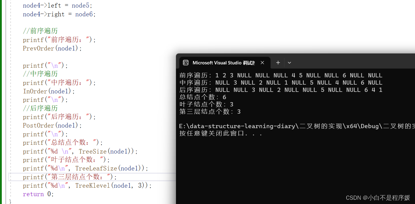 总结: 二叉树的遍历是用函数递归实现的,确实比较难以理解,我们不仅仅是只做到代码实现层面,还好依据函数递归画出递归的展开图,以便于我们理解和加深印象,这块部分还得多画图。