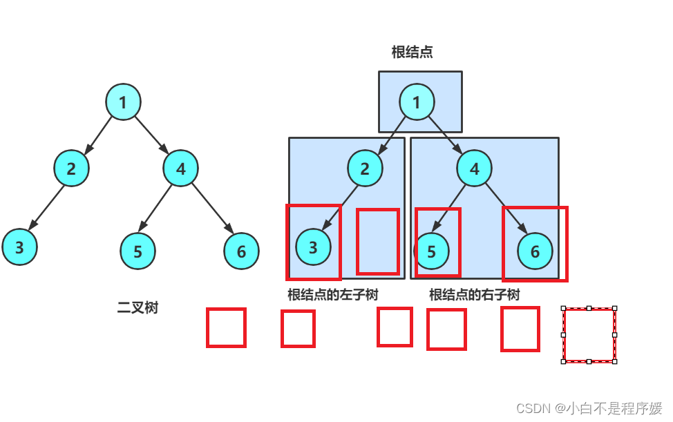 我们可以将一个二叉树分成左右两个子树,两个子树又一次分成两个子树,这样一个二叉树就可以被我们拆解左右拆解开来,如果没有左/右孩子记作空。