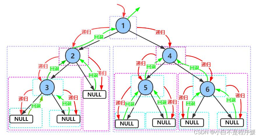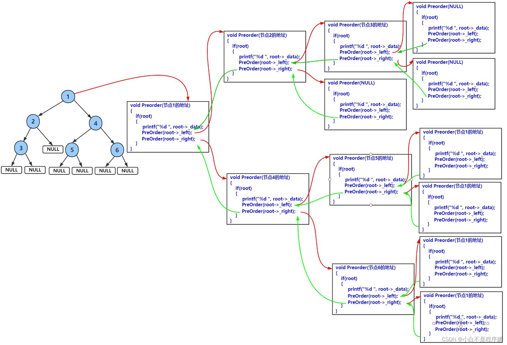 首先判断根节点是否为空,如果为空则代表空树返回NULL;前序遍历是先访问的根,因此直接打印数据,在依次进入左右子树。这里文字很难讲解清楚,我们直接上函数递归调用图。
