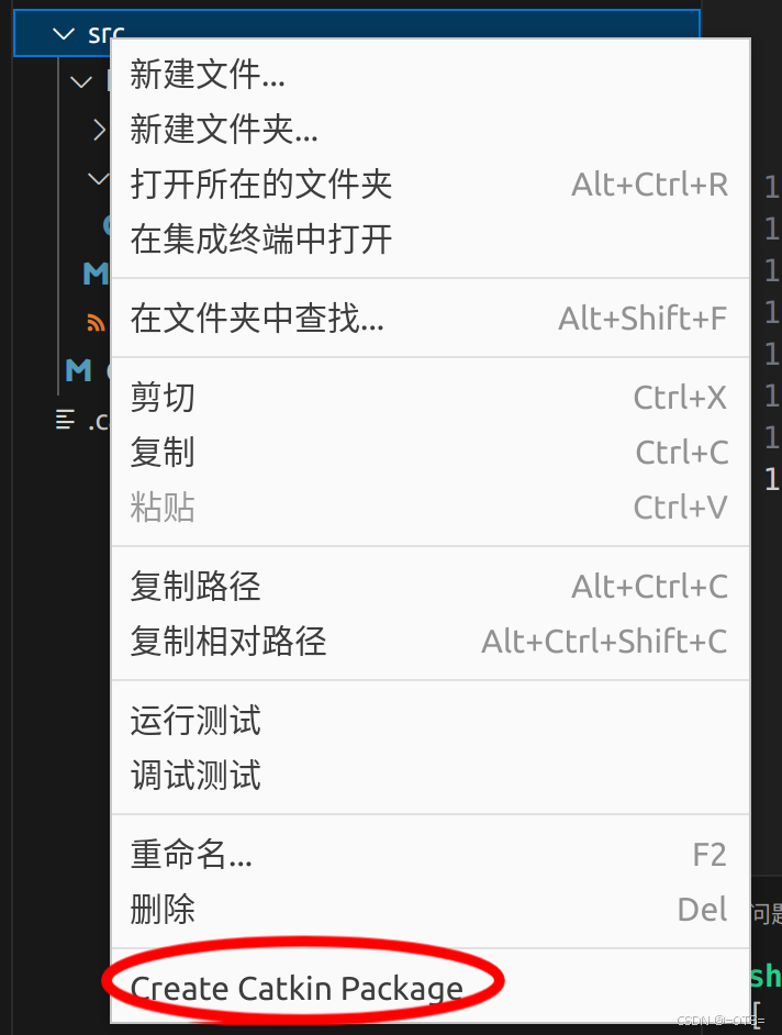vscode文件栏选中catkin_ws/src后右击,选择 create catkin package,依次填入包名和依赖,这里我分别用helloROS 和 (roscpp rospy std_msgs)为例