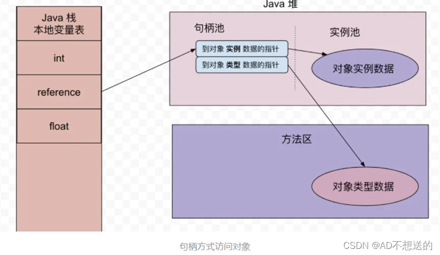 对象的访问目前两种方式 句柄 直接指针 在 Java 堆中开辟一个句柄池,reference 持有的地址是句柄地址,句柄存放对象实例数据的指针和对象类型数据的指针。 这样做的好处是当对象移动的时候只需要改变句柄的地址,reference 本身不需要改变。 refeerence 直接保存的就是对象的地址,对象的空间里存储着访问类型数据的相关信息。这样的好处是节省一次指针的开销。定位效率高。